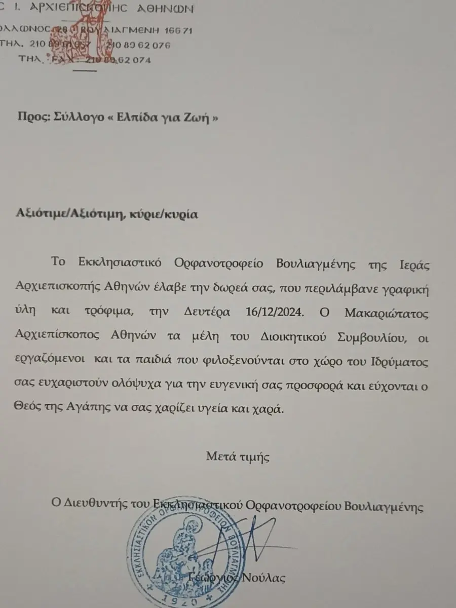 Ο Σύλλογος Ελπίδα Για Ζωή στις 16.12.2024 επισκέφτηκε το "Εκκλησιαστικό Ορφανοτροφείο Βουλιαγμένης" όπου προσέφερε στα παιδιά που φιλοξενούνται εκεί, γραφική ύλη, τρόφιμα και χυμούς.