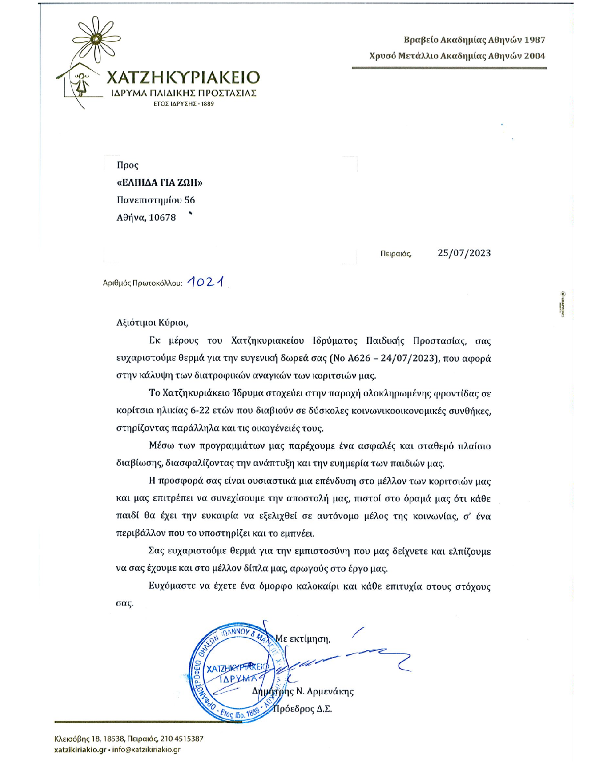 Ο Σύλλογος Ελπίδα Για Ζωή επισκέφτηκε στις 25/07/23 το Χατζηκυριάκειο ορφανοτροφείο όπου φιλοξενεί 60 κορίτσια από τεσσάρων ετών μέχρι δεκαοκτώ ετών και πρόσφερε διάφορα γλυκίσματα.